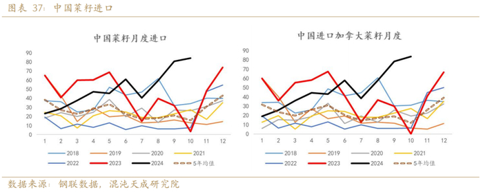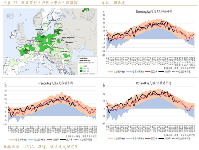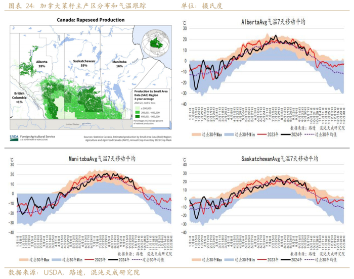 欧盟菜籽在4月遭受霜冻灾害,导致24年8月收获的欧盟菜籽发生减产,产量同比减少14%。加拿大菜籽在7-8月开花关键生长期遭受高温胁迫,产量同比减少2%。全球两大主产国发生不同程度减产。菜籽的收获时间在8-9月,2024年菜籽的产量决定了2024年9月到2025年9月菜系的供给。