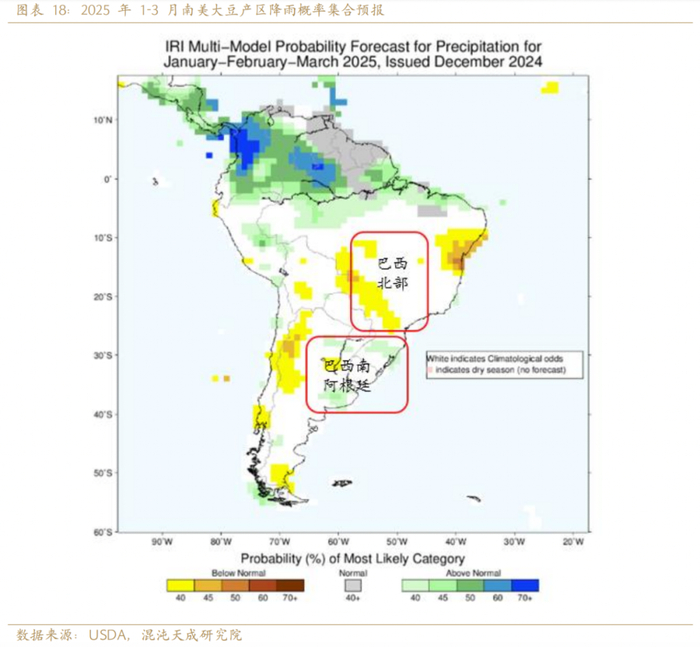 IRI多模型预报2025年1-3月巴西和阿根廷大豆产区降雨基本正常。其中巴西北部正常,局部可能降雨偏少。巴西南部和阿根廷降雨正常,局部降雨偏多。