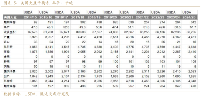 2024年美国大豆生长期天气正常,美国大豆产量增加7.2%。美国农业部预测2025年结转库存从3.4亿蒲式耳增加到4.7亿蒲式耳。