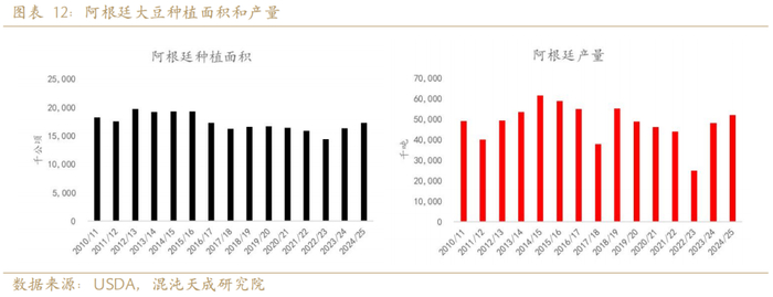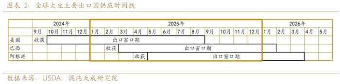 全球三大主产国,美国、巴西、阿根廷产量占全球大豆总产量的80%。三个国家产量共同决定了全球大的供给状态。美国大豆2024年10月上市,对全球出口时间持续到2025年9月。巴西大豆2025年2月上市,对全球出口时间持续到2026年1月。阿根廷大豆2025年5月上市,对全球出口时间持续到2026年4月。
