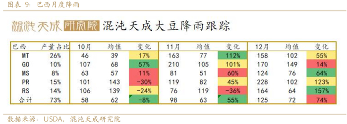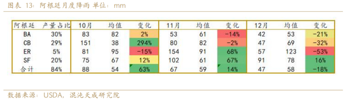 阿根廷10月累计降雨同比历史增加63%,11月降雨较历史均值偏多14%。12月降雨较历史均值略偏少18%。10月以来的降雨偏多,土壤墒情充足,目前12月降雨偏少不足以引发干旱对生长影响较小。