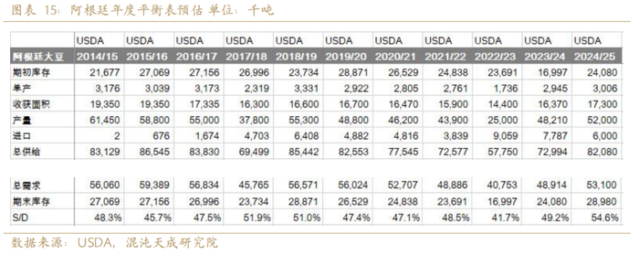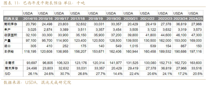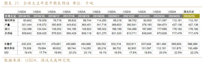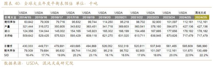 全球大豆平衡表库存增加约2000万吨,大豆供需处于宽松的状态,我们预计2025年库存消费比从2024年的20%增加到22.2%。