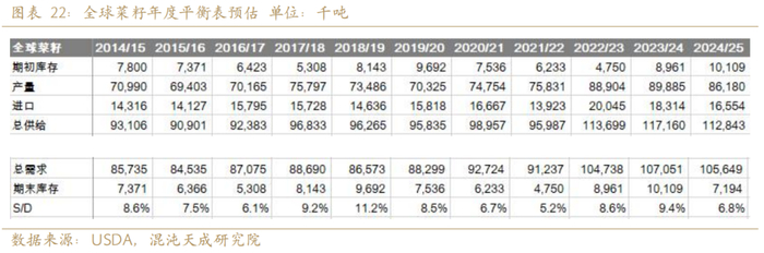 我们预计全球大豆库存环比增16.3%,略低于USDA的17.6%。库存消费比从20%升至22.2%,大豆供需继续保持宽松。菜系方面,我们参考USDA,预计菜籽库存预计同比减30%,库存消费比从9.4%降至6.8%。
