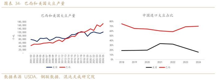 特朗普曾表示上台之后将对中国加征60%关税。回顾其上一次任期中美之间的贸易摩擦,中国通过征收来自美国的大豆关税予以反击。如果2025年1月特朗普就任之后,发生的关税摩擦,来自美国的大豆可能面临加征关税。总体评估本次如果加征关税的影响将小于2018年。巴西大豆产量增加使得中国对美国大豆的依赖度降低。巴西大豆产量从1.2亿吨增加1.7亿吨,巴西增量5000万吨。中国一年需要进口1.1亿吨,巴西的产量可以满足中国的需求。