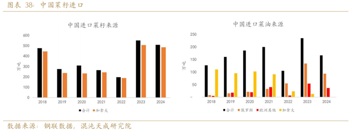 中国自2024年9月启动对加拿大菜籽的反倾销调查。如果反倾销成立,将对加拿大菜籽征收反倾销关税。这将抬升进口菜籽成本导致菜粕和菜油价格升高。中国进口菜籽几乎全部来自加拿大,对菜粕影响较大。菜油进口主要来自欧洲地区,影响相对较小。