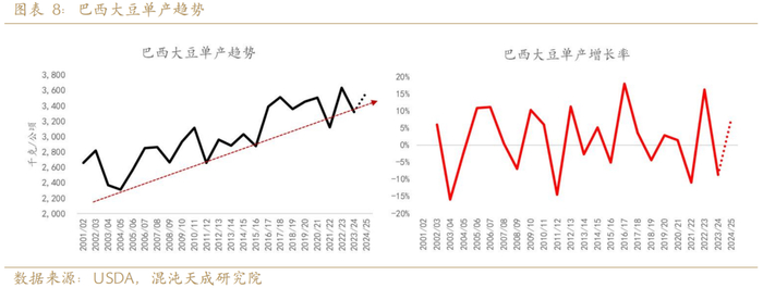 由于转基因大豆的大规模推广,排除天气灾害造成的减产后,巴西大豆平均单产中枢上移呈现趋势性提高。2025年气象机构预报拉尼娜发生概率从50%下降到30%,目前南部大豆生长天气正常,假设单产维持正常水平,总产量达到1.7亿吨,同比增加2000万吨。