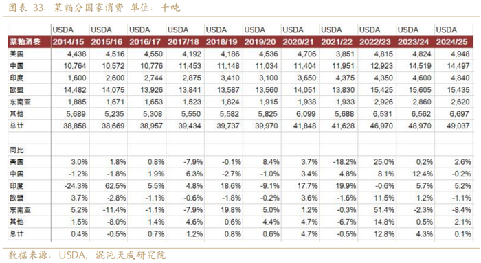 蛋白粕类需求稳定,依赖全球人口增长和GDP增速,考到了到中国生猪供给在2025年将增加11-15.7%,这将增加中国的豆粕需求,我们预测2025年蛋白粕需求同比增3.4%,略高于USDA预测的3.2%。其中豆粕需求增5.4%,略高于USDA预测的5%。菜粕需求方面,我们采用USDA的预测,预计全球菜粕需求增0.1%。