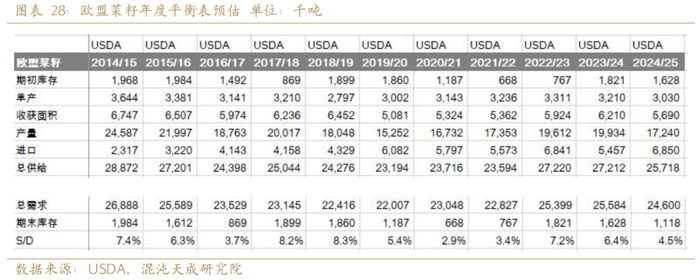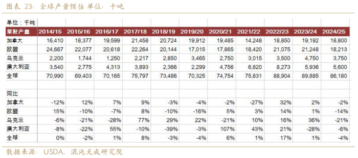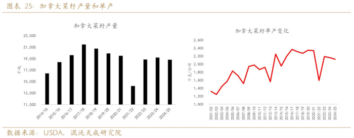 2025年全球菜籽供给预计减4%。欧盟受霜冻影响,菜籽产量减14%,加拿大受高温影响,产量减2%。