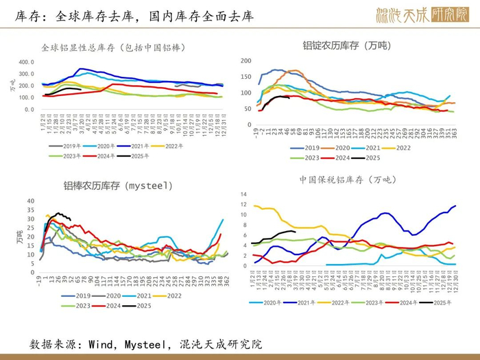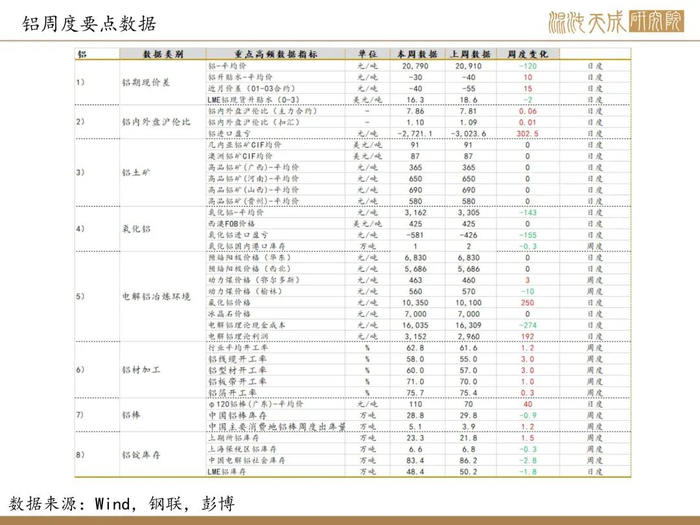 本周铝锭+铝棒厂库加社库环比-9.3至147.5万吨,现货贴水30元。LME去库1.8至48.4万吨,海外库存延续去库。