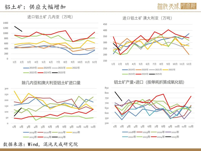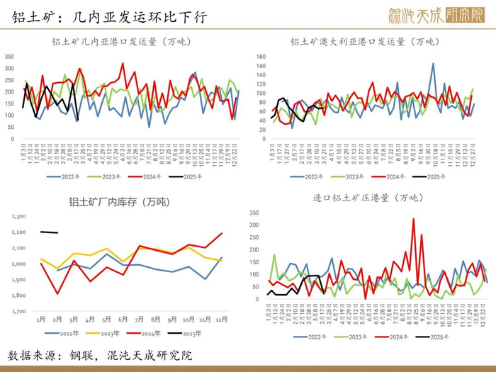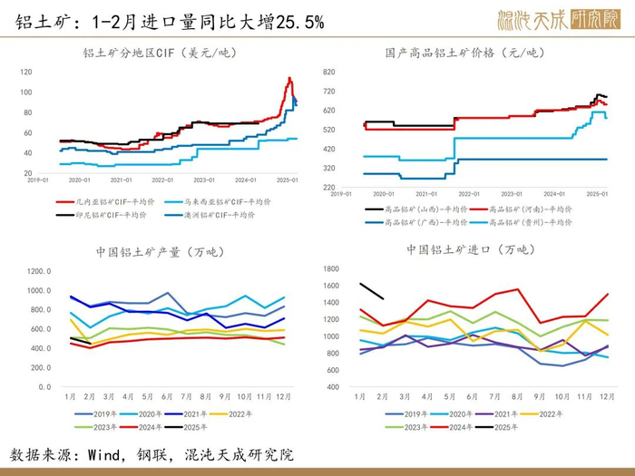 3.【中国1-2月铝矿砂及其精矿进口量同比增加25.6%】海关总署3月18日公布的数据显示,中国2025年1月铝矿砂及其精矿进口量为1621万吨,同比增加23.3%;2025年2月铝矿砂及其精矿进口量为1441万吨,同比增加28.3%;1-2月铝矿砂及其精矿进口量为3062万吨,同比增加25.6%。(海关总署)