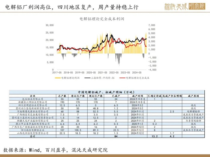 电解铝行业平均理论现金成本及完全成本约14200元/吨、 15600元/吨,原料端氧化铝价格环比下行,预焙阳极价格持平,煤价下行,电解铝厂利润较好,四川逐步复产,产量持稳小幅上行。