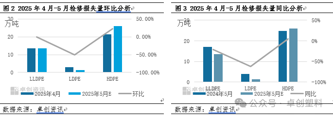 据卓创资讯数据统计,预计2025年5月LDPE检修损失量在1.46万吨,同比下降62.47%,环比下降51.17%;LLDPE检修损失量在13.55万吨,同比减少21.04%,环比下降0.29%;HDPE检修损失量预计在26.11万吨,同比增加5.41%,环比增加22.12%。
