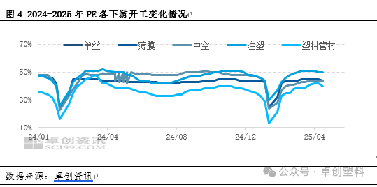 2025年5月,聚乙烯下游需求整体表现平淡,终端需求低迷,下游开工率低于去年同期,订单缩量维持刚需为主。具体来看,下游主要行业如农膜、包装膜、注塑等开工率均呈现下降趋势。