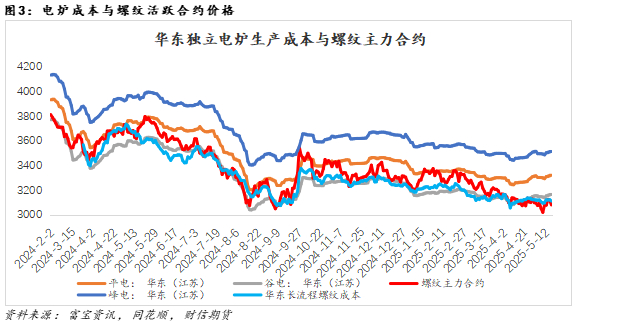 从静态估值来看,螺纹钢主力10合约全线跌破钢厂螺纹成本,静态绝对估值中性偏低。据富宝资讯,截止5月16日,华东独立电炉平电生产成本在3327元/吨,华东独立电炉谷电生产成本在3171元/吨(富宝各地区谷电平均成本在3196元/吨),华东长流程螺纹钢生产成本在3113元/吨。建材淡季临近,钢厂减产预期略有所增强,短期华东长流程螺纹钢成本或是螺纹钢10合约压力位所在。