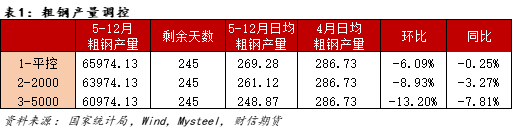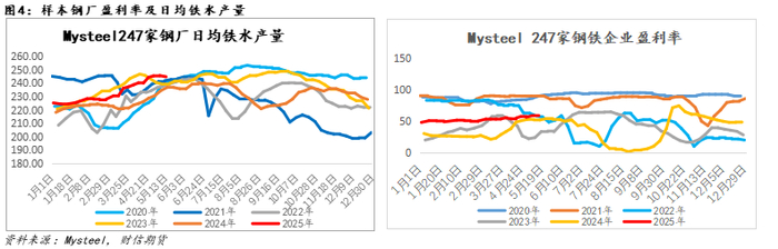 钢厂盈利率稳中有增,铁水产量高位虽有所回落,但回落速度或偏慢。据Mysteel调研,截止5月15日,247家样本钢厂日均铁水产量为244.77万吨,环比下降0.87万吨;样本钢企盈利率为59.31%,环比增0.44个百分点。中长期来看,重点关注粗钢产量调控政策。