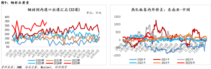 从钢材直接出口角度来看,短期虽有波动,但钢材出口仍维持在高位。据SMM,25年第20周,32港钢材出港量为335.45万吨,环比增加35.93万吨。从内外价差来看,东南亚热卷与国内热卷价差收缩至120左右。关税及严查买单出口扰动下钢材出口下降预期尚存,关注兑现情况,谨防预期差(若钢材出口持续维持高位,钢材出口偏弱预期未能兑现,市场对需求偏弱预期或有纠偏)。