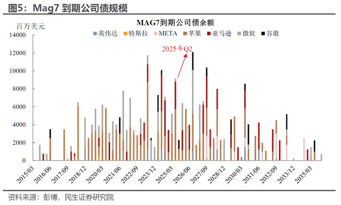 第一,虽然债务融资并不是这些科技巨头的主要融资手段,但是大多数公司也确实没有抵御住美联储“无限量宽松”的“诱惑”,在零利率且量化宽松时期发行了债务,从图5中可以看到23年-27年都是Mag7的低息债务到期相对较为集中的区间。