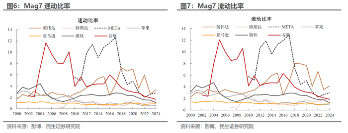 第二,从方向来看,Mag7中多数企业的速动比率在疫情后盈利增速和经营性现金流不断改善的背景下还在下行,说明了这些巨头对未来AI产业的预期相对乐观,军备竞赛时不我待,Capex支出增加侵蚀了这些企业的偿债能力。