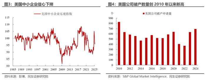 其实,美国需求环境开始恶化的证据已经开始出现:美国小企业信心指数(反映投资意愿的关键指标)快速走弱,表明中小企业对经济前景较为悲观,2024年破产公司的数量也已经创下2010年以来的新高,比疫情爆发的2020年还高(图3-4)。
