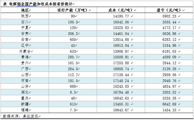 通过对比近两期中国电解铝成本比重变化,主要体现在氧化铝方面,原料氧化铝价格较上月上涨,电价变动不大,预焙阳极价格上涨,电解铝生产成本增加,而电解铝价格小幅上涨,涨幅小于成本增加幅度,企业利润空间再度缩窄。从卓创资讯跟踪的全国各省份的加权生产成本情况来看,成本最低的企业集中在新疆、内蒙古、云南地区,成本最高的是福建地区。