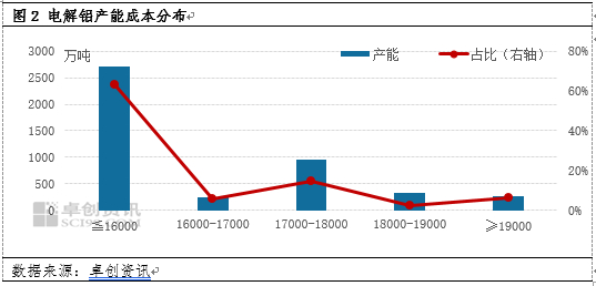 本期全国电解铝亏损产能占比较上月变动不大。据卓创资讯统计,本期电解铝产能成本在16000元/吨以下的产能规模为2702.9万吨,占比63.10%;16000-17000元/吨产能规模为242.3万吨,占比5.66%;17000-18000元/吨产能规模为965万吨,占比14.43%;18000-19000元/吨产能规模为326.2万吨,占比2.41%;产能成本大于19000元/吨的产能规模270万吨,占比6.30%。