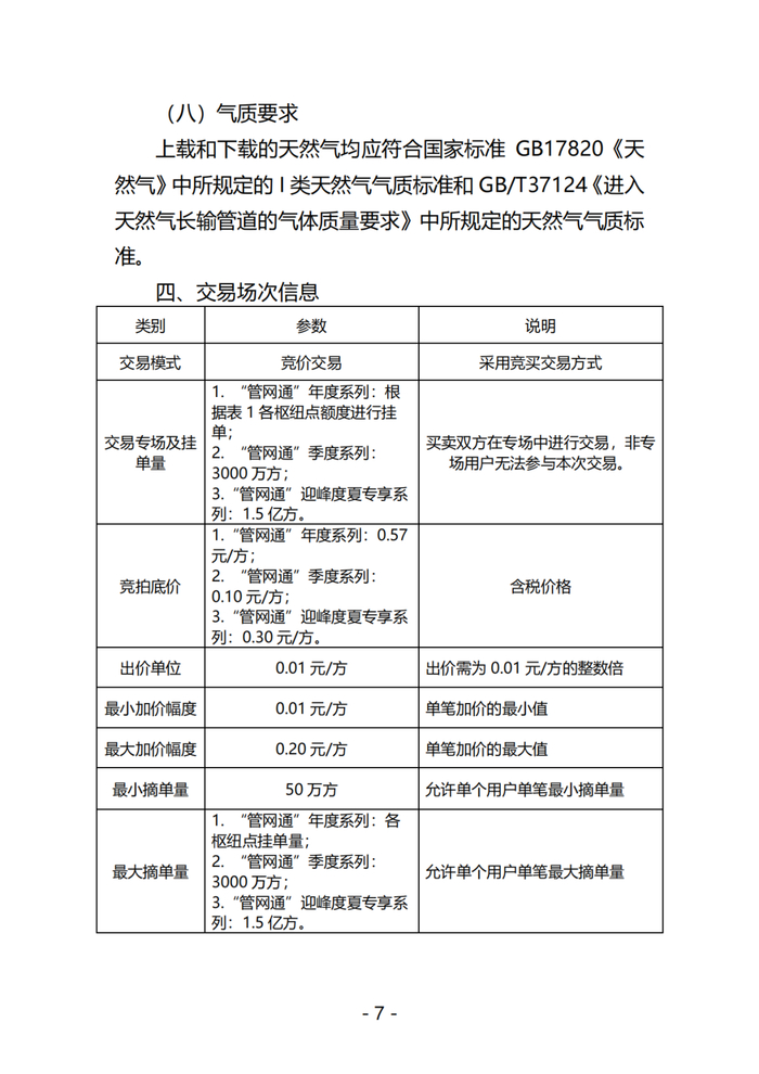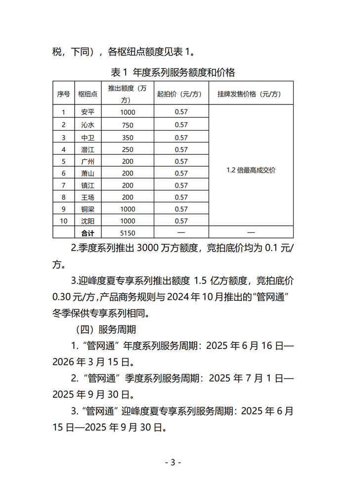 3.迎峰度夏专享系列推出额度1.5亿方额度,竞拍底价0.30元/方,产品商务规则与2024年10月推出的“管网通”冬季保供专享系列相同。
