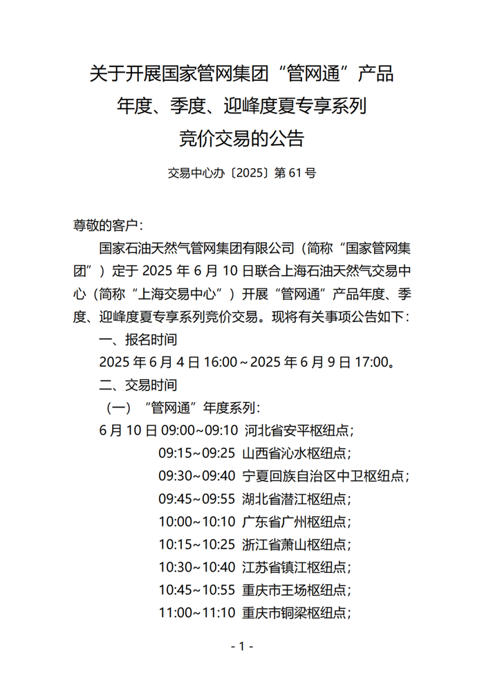 国家石油天然气管网集团有限公司(简称“国家管网集团”)定于2025年6月10日联合上海石油天然气交易中心(简称“上海交易中心”)开展“管网通”产品年度、季度、迎峰度夏专享系列竞价交易。现将有关事项公告如下: