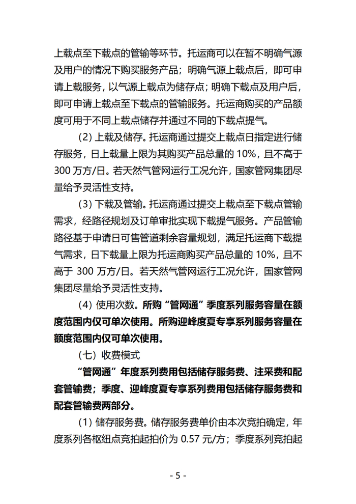 “管网通”年度系列费用包括储存服务费、注采费和配套管输费;季度、迎峰度夏专享系列费用包括储存服务费和配套管输费两部分。