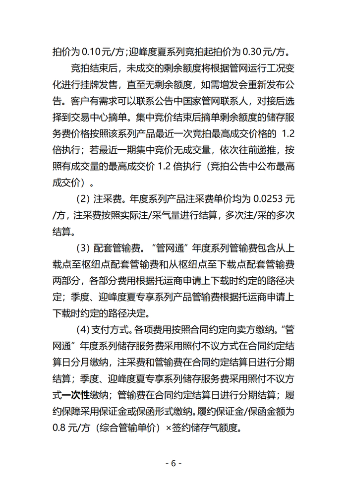 (4)支付方式。各项费用按照合同约定向卖方缴纳。“管网通”年度系列储存服务费采用照付不议方式在合同约定结算日分月缴纳,注采费和管输费在合同约定结算日进行分期结算;季度、迎峰度夏专享系列储存服务费采用照付不议方式一次性缴纳;管输费在合同约定结算日进行分期结算;履约保障采用保证金或保函形式缴纳。履约保证金/保函金额为0.8元/方(综合管输单价)×签约储存气额度。