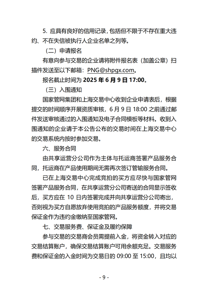 国家管网集团和上海交易中心收到企业申请表后,根据提交的时间顺序开展资质审核,6月9日18:00之前通过邮件发送审核通过的入围通知及电子合同模板等材料。收到入围通知的企业请于本公告公布的交易时间在上海交易中心的交易系统内按时参加交易。