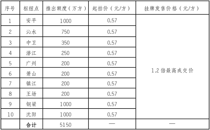 1.年度系列5150万方额度,竞拍底价0.57元/方(含税,下同),各枢纽点额度见表1。