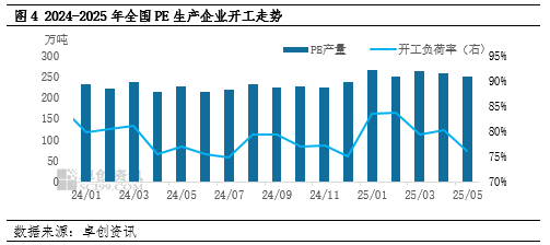 2025年5月份国内PE开工负荷在76.24%,较4月份降4.06个百分点,较去年同期降0.83个百分点。5月抚顺石化老HDPE装置结束经营性停车,华东某合资企业结束大修,本月新增兰化榆林、宁夏宝丰、中煤榆林、中韩石化、东北某企业和燕山石化部分PE装置大修,其余新增检修装置以小修为主,PE石化装置月度检修损失量处于年内较高水平。