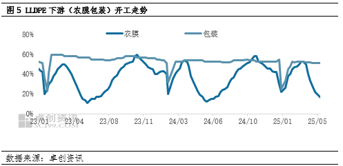 5月下游开工多数下跌。5月农膜开工下降15个百分点至18,包装开工下降1个百分点至51%。
