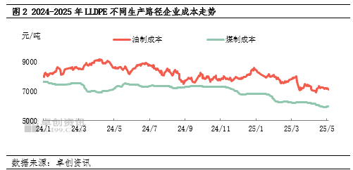 5月份不同生产路径企业成本继续走低。其中油制LLDPE平均生产成本走低在7209元/吨,环比跌2.31%;煤制LLDPE平均成本走低在6002元/吨,环比跌3.82%。