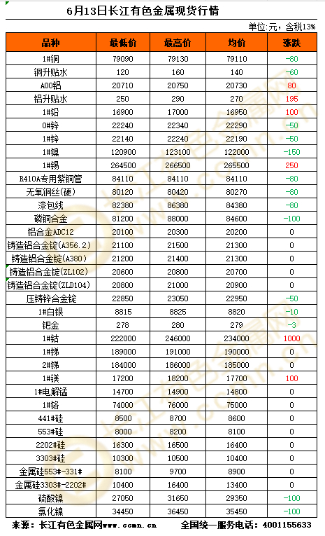 6月13日长江有色金属现货行情