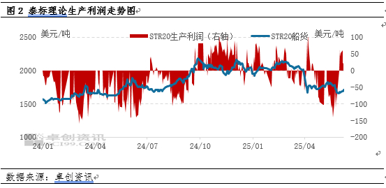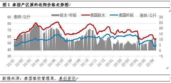 从泰国主产区天然橡胶产出季节性特点来看,泰国东北部产区4月中旬开始进入开割期,南部产区5月中旬进入开割期,6月份产量呈现季节性增加的趋势。2025年实际物候及产区表现来看,5月底东北产区开割面积在9成附近,南部产区在5-6成附近,产区开割面积逐步扩大,原料产出呈现季节性增加趋势,对原料价格形成一定负反馈。但产区雨水较多,割胶工作开展并不顺利,导致原料整体增量节奏偏缓。6月初原料收购价格受天然橡胶整体行情拖拽影响下跌后,再次呈现出企稳震荡的走势。反馈出目前泰国主产区原料上量并不顺畅,产量约旺产季的4成左右,短期产出压力释放不大。