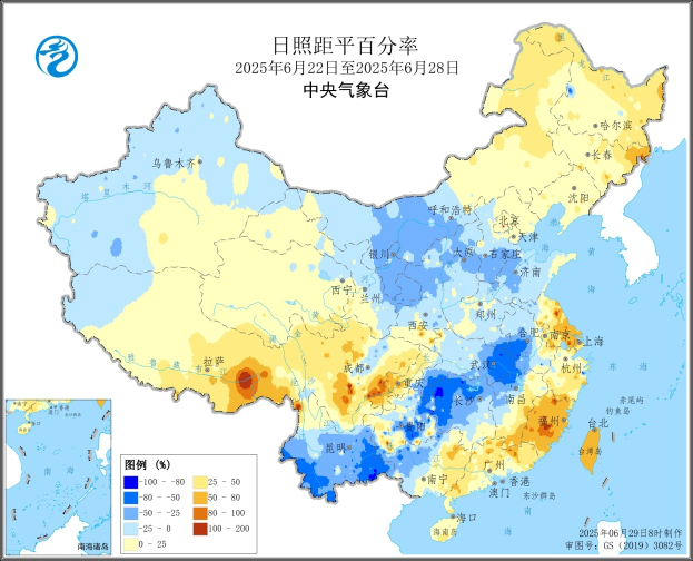 本周(2025年6月22-28日),华北东部、东北、新疆气温较常年同期偏高2~6℃,西北地区东北部、江淮西部、江汉、江南西部、西南地区南部等地气温偏低1~3℃,全国其余农区气温接近常年同期(图1)。西北地区东部、华北南部、东北地区南部、黄淮南部、西南地区东部等地降水量有10~50毫米,长江中下游、华南西部、西南地区南部等地降水量有50~250毫米,贵州中部达250~400毫米(图2),上述大部地区降水量较常年同期偏多1~2倍;东北地区大部、黄淮北部、江南东南部等地偏少3~8成。全国大部农区日照时数接近常年同期,江淮东部、江南东南部、华南大部、西南地区东部等地较常年同期偏多3~8成,江汉东部、江南西部、西南地区南部等地偏少3~8成(图3)。