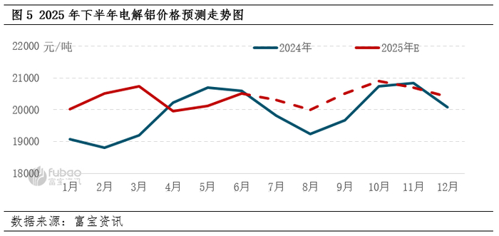 下半年,电解铝市场或偏弱震荡后随着旺季到来走强,临近年底价格季节性回落,总体整体维持高区间震荡,运行区间或扩大至19700-21500元/吨之间,均价20400元/吨,高于上半年。下半年影响电解铝价格走势的主要驱动或将落脚在需求表现及库存变化。需求端在国内投资和消费仍有增量预期的支撑下,一定程度抵消出口端变数。下半年铝水就地转化率预计将高于上半年,新产能释放偏向四季度,供应增量有限,库存低位或将成为常态。若在下半年市场期待的贸易战进一步缓和、美联储降息、国内增量措施利好刺激之下,铝价或仍存在突破年内高位的预期。