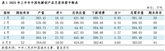 2025年上半年电解铝市场基本面运行稳健,虽受到对等关税影响,需求端面临一定出口压力,但总体呈现较强韧性,供需平衡仍呈现良性态势。就月度平衡来看,年内库存基本处在近五年低位水平,二季度去库提速,至6月底降至近5年新低,至6月底铝锭社会库存降至41万吨左右,供需格局略显紧凑。