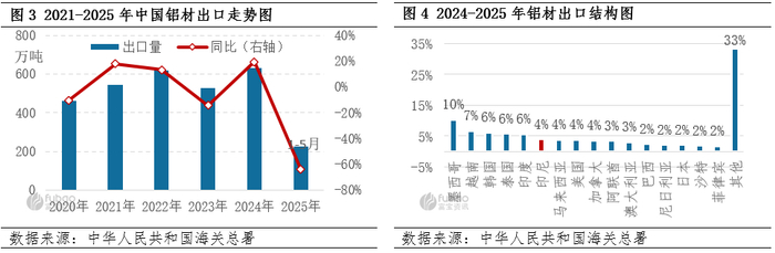 国内对原铝出口有限制,因而国内铝产品出口以铝材形式为主。就出口数据来看,据中华人民共和国海关总署数据显示,2025年1-5月中国铝材产品出口量为226.82万吨,同比减少17.59万吨,减幅7.2%。结合抢出口减少、贸易变数及季节性出口波动因素来看,预计上半年总出口约在280万吨,同比减少22.57万吨,减幅7.46%,出口的萎缩量处在可控区间。而就过去10年的数据来看,国内铝材出口以年均6.26% 的速率增长