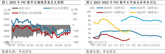 前期由于国内PVC粉出口接单及交付持续偏好,出口同比保持较为明显的增幅,PVC粉华东华南仓库库存自春节假期后长期保持去库趋势,整体行业库存逐渐降至同比低于2024年的水平,华东仓库库容压力也较2024年有所减轻。截至2025年7月10日华东华南样本仓库库存为57.54万吨,对比2024年同期减少28.85万吨。