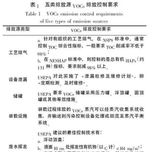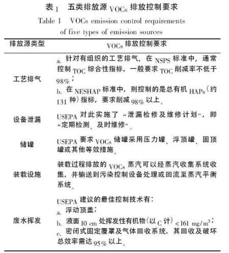 常规污染物包括PM、CO、O3、SO2、NOx、Pb、有机物( VOCs)、酸性气体(氟化物、HCl)等。我国暂未把挥发性有机物(VOCs)列为常规污染物进行控制。而美国为控制光化学烟雾和臭氧层破坏等环境问题,对VOCs的排放作了详细的规定。首先,涉及这类污染物的行业都制订有行业排放标准,包括炼油、石化、精细化工(杀虫剂、涂料、染料颜料等杂项有机化学品)、油品储运、制药、表面涂装、出版印刷、铸造、服装干洗等。在排放标准中又根据排放源类型的不同,分工艺排气、设备泄漏、废水挥发、储罐、装载操作五类源,分别规定了排放限值、工艺设备和运行维护要求,具体见表1。