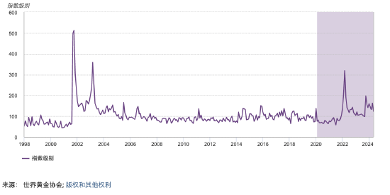 可以将目前的动荡局势简单归结为新常态,但近年来地缘政治风险始终处于上升态势,且不太可能在短期内得到缓解(图4)。政治两极分化、武装冲突频发、全球化进程受阻,而民族主义和结盟主义抬头,令不稳定的全球经济雪上加霜。地缘政治风险向来难以预测,可能在最意想不到的地方露出獠牙。然而黄金对地缘政治的反应却肉眼可见:地缘政治风险(GPR)指数每上升100点,金价就会上涨2.5%。2虽然有些只是短期影响,但也可能成为金融状况恶化的导火索,从而产生长期效应。