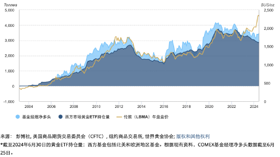 近年来,央行购金需求始终是黄金市场的重要驱动力。我们估计,2023年央行购金为黄金表现贡献了至少10%的影响力,而今年迄今可能已贡献出约5%的影响。不过,根据中国人民银行的公开报告,其近几个月来的购金量有所下降,而截至五月底,人行黄金储备保持不变。 中国人民银行停止宣布购金的消息叠加近期的净售金势头,令人担心央行购金需求会否放缓。但我们仍然预计,今年央行购金需求仍将高于平均趋势水平,金属聚焦公司(Metals Focus) 在最新《黄金聚焦》报告中也持相同观点。3虽然已公开的央行总购金量有可能低于去年,但总售金量也出现下降,主要原因是2023年初土耳其的抛售潮没有在今年重演。央行的购金需求往往以政策为驱动,因此很难确定央行购金时机,但我们最近开展的2024年全球央行黄金储备调查得出了令人欣慰的结论:黄金储备管理官员表示他们将继续对黄金持积极态度.