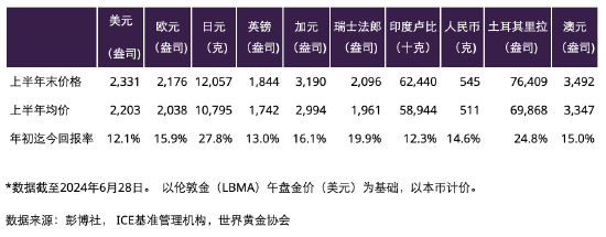 今年以来,黄金屡次登上新闻头条。三月中旬至五月中旬,金价多次刷新历史新高。撰写本文之际,年初迄今金价已上涨12%,且二季度大部分时间里的金价都在2,300美元/盎司以上运行。1在多个国家,以本币计算的黄金回报率都达到了两位数(表1)。