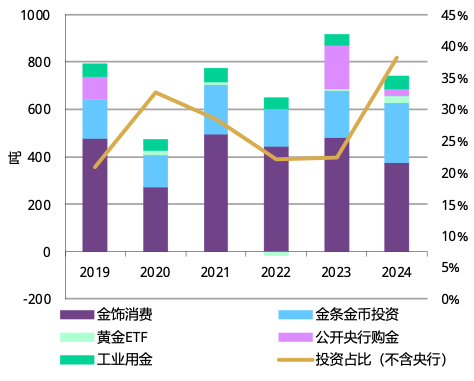 2024年迄今为止,中国市场黄金需求主要由投资拉动