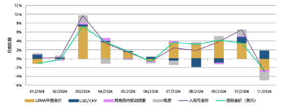 [1] 数据基于2019年1月至2024年11月期间的人民币金价月度变化。国内驱动因素包括上海期货交易所黄金期货交易量、中国制造业采购经理人指数及离岸人民币12个月远期点的月度变化。