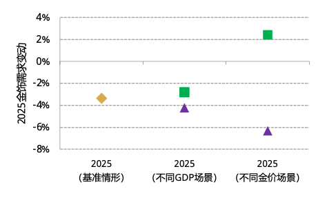 [4] 2025年金饰需求变化是基于我们中国市场金饰需求年度模型所得,该模型包括年度GDP、结婚人数、Au9999金价和平均抵押贷款利率的变化。在GDP/人民币金价场景中,我们假设其他因素保持不变。价格情景基于人民币金价加/减一个年度标准差。