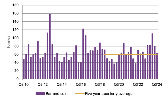 图4:三季度金条和金币投资势头减弱,但仍维持在健康水平