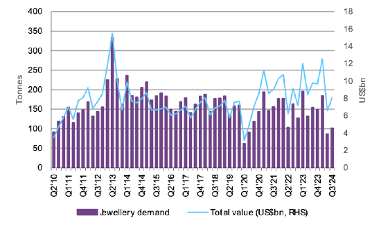 2024年前三季度,中国市场金饰需求同比下降23%降至373吨,主要原因也与上述因素类似。